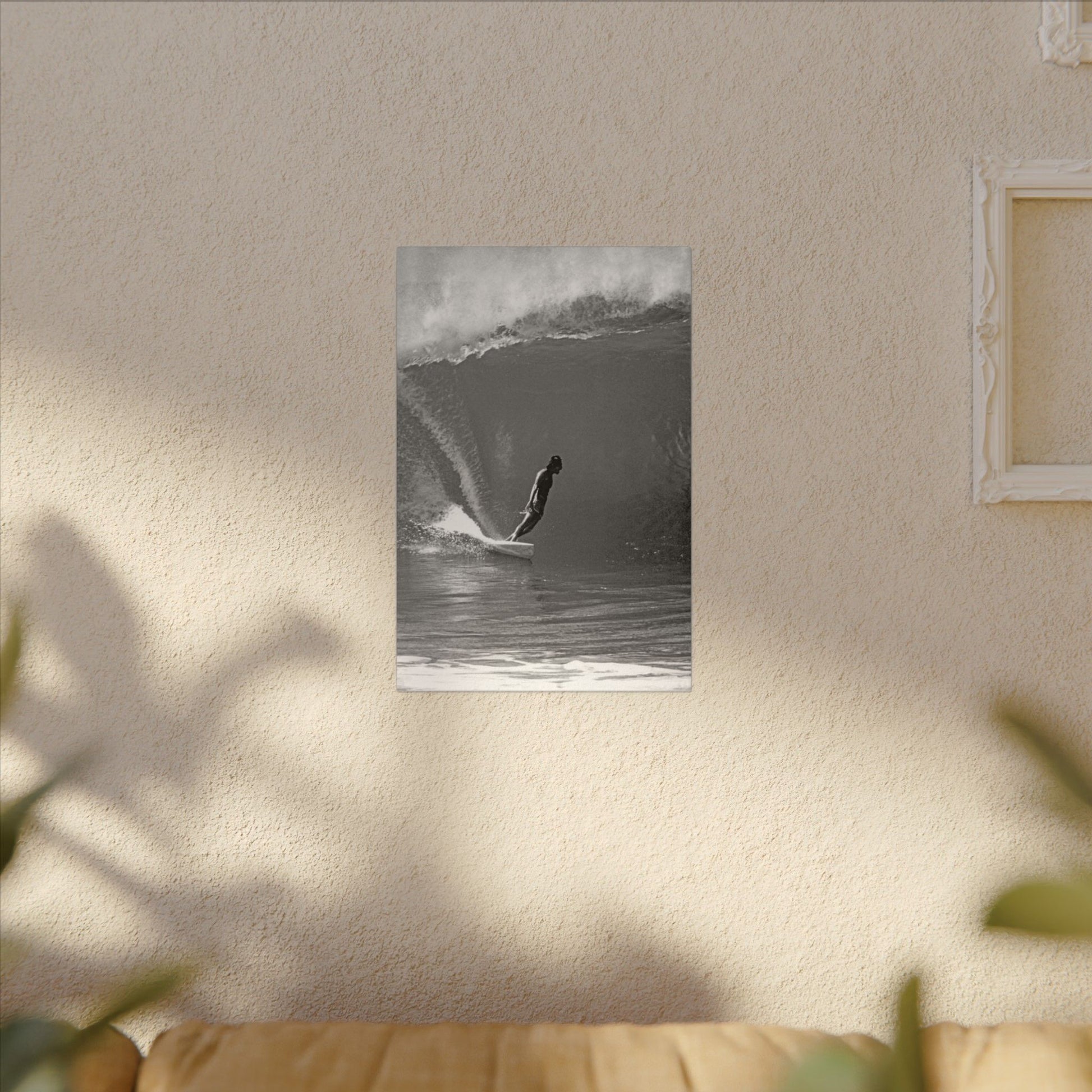This canvas freezes one of the rarest sights in surfing: absolute calm inside absolute chaos. A lone rider stands tall and centered as a mountain of water folds itself around him — unhurried, unshaken, untouched by fear. It’s a visual mantra, a reminder that real mastery isn’t loud… it’s silent, precise, and earned.