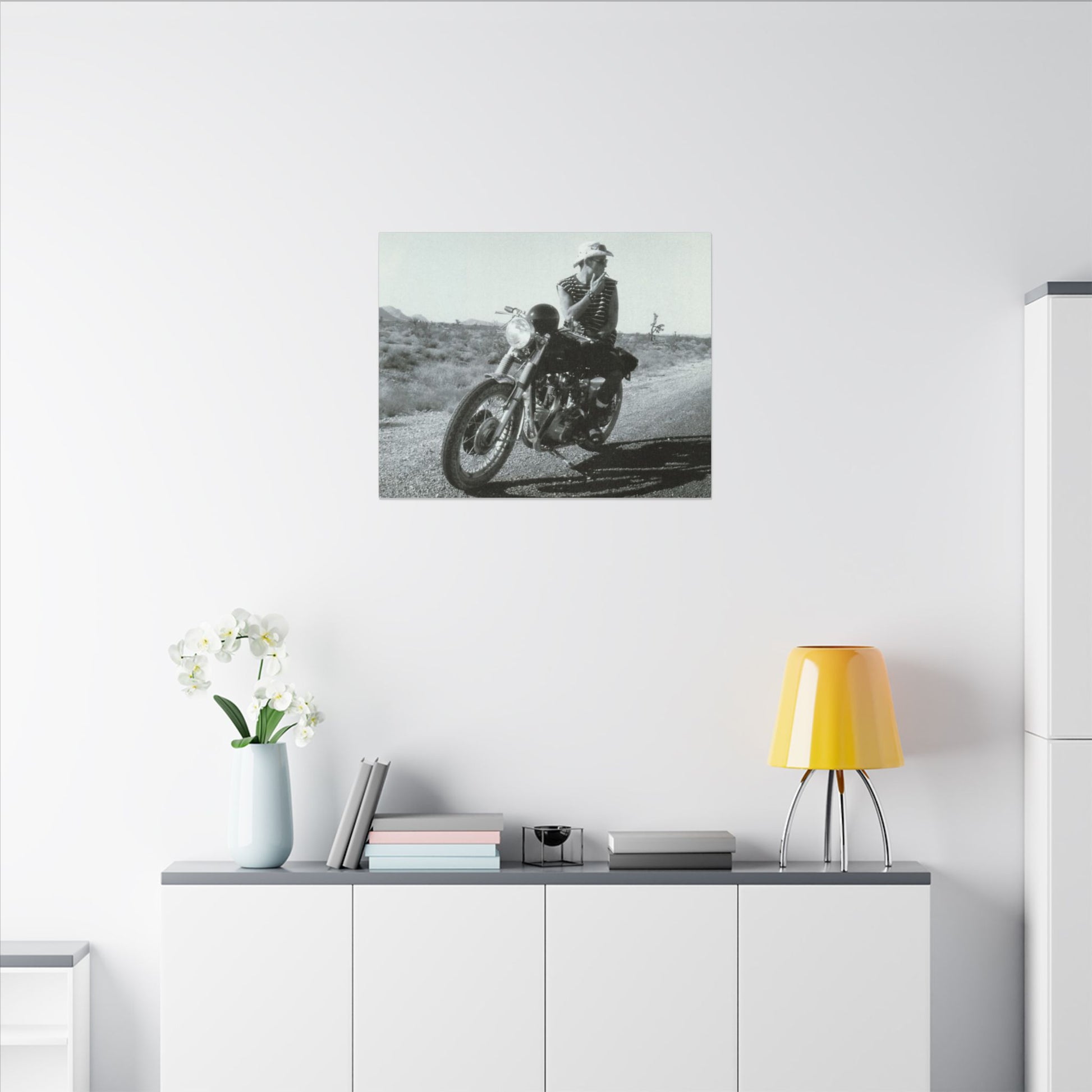 This canvas captures the outlaw spirit that defined the golden era of American counterculture — the desert highway, the stripped-down bike, the cigarette, and that unmistakable air of rebellious clarity. A moment suspended in time, echoing the raw, frenetic, fearless energy made famous by writer and icon Hunter S. Thompson.