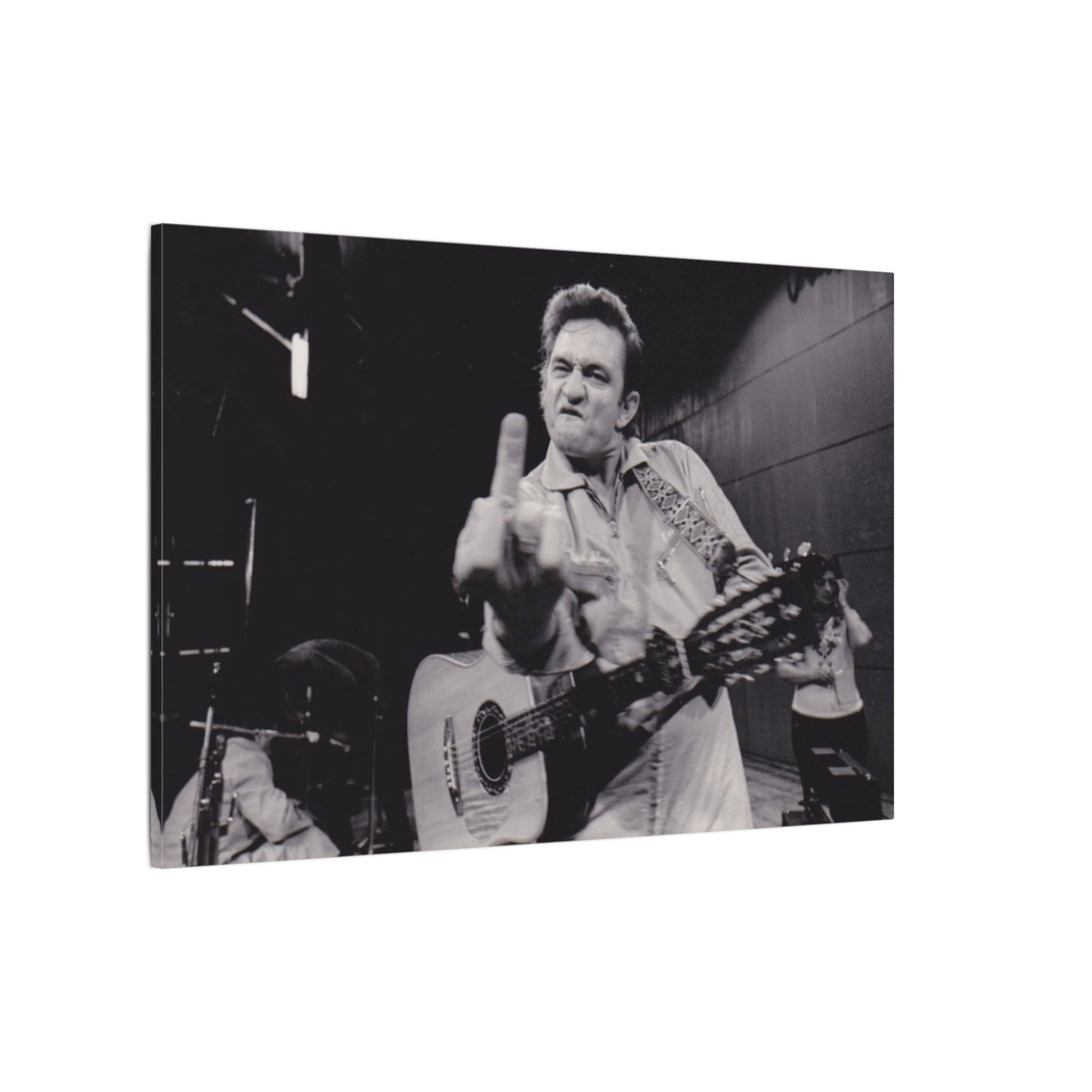 This canvas freezes a moment of raw attitude — a musician onstage, guitar in hand, firing off a universal message without saying a word. No polish. No PR. Just defiance, grit, and the kind of outlaw spirit you can feel through the photograph.